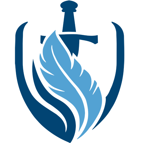 The Frontline Catholic Formation logo is a bold emblem in deep navy and azure blue. Its shield-like crest centers an upright sword crossed by a flaming quill pen—honoring educators as frontline warriors in faith formation, inspired by Frontline’s patrons: St. Peter and St. Paul. The sword evokes St. Paul's "sword of the Spirit" as the Word of God (Hebrews 4:12) and the quill his evangelizing epistles. The rising flame symbolizes illumination, calling believers "out of darkness into marvelous light" (1 Peter 2:9)—echoing St. Peter's bold witness. The blue hues convey both serenity and devotion, reflecting the Blessed Virgin Mary's purity, protection, and guidance.