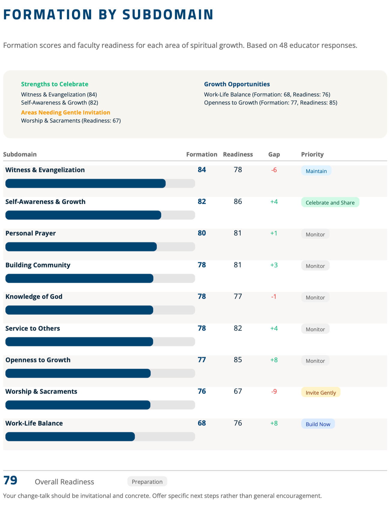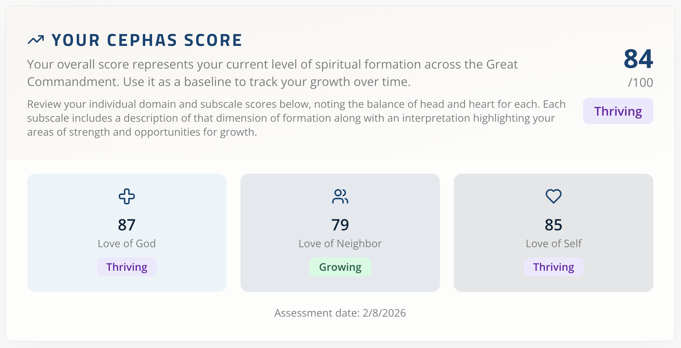 strengths and growth areas in each of the three domains (Love of God, Love of Neighbor, and Love of Self)