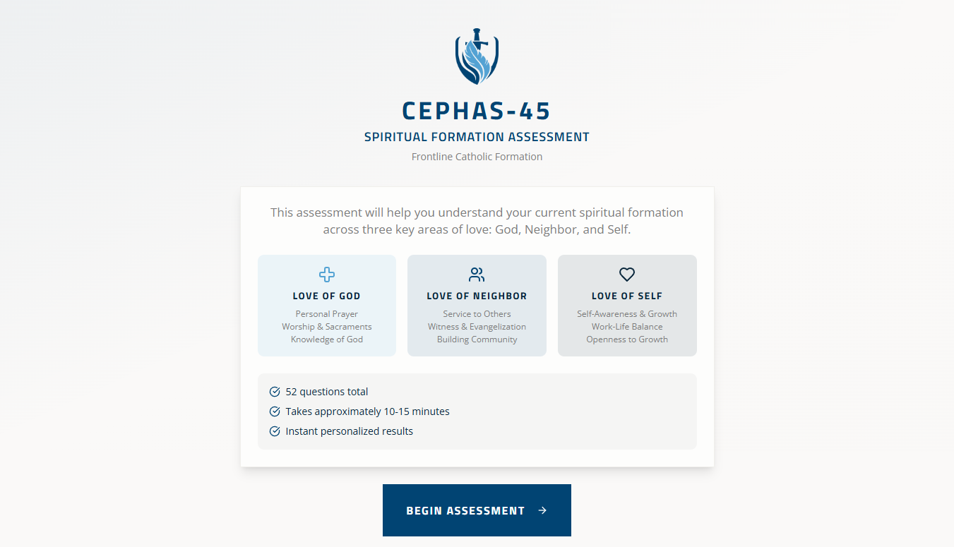 The CEPHAS Assessment uses three complementary question types across three spiritual domains (Love of God, Love of Neighbor, Love of Self) and nine “sub-scales (i.e. Prayer & Interior Life, Educational Witness & Ministry, Self-Awareness & Integration) to create a comprehensive profile of your spiritual formation journey. Our assessment investigates intellectual understanding (head), affective experience (heart), and readiness to grow (motivation). Below are sample questions that illustrate this holistic approach.