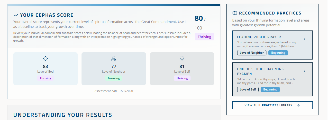 The Educator report shares an overall CEPHAS score, scores in each of the three domains (Love of God, Love of Neighbor, and Love of Self), and an in-depth analysis of each of those domains, broken down into three subdomains each.